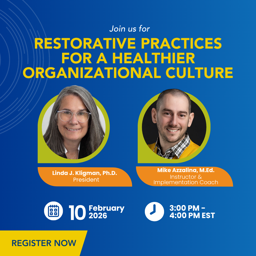 Join us for a webinar on February 10 at 3:00 p.m. EST as President, Dr. Linda Kligman, and Instructor and Implementation Coach, Mike Azzalina, M.Ed., explore these questions through the lens of restorative practices' positive effect on workplace culture. Looking at Dr. Kligman’s 2024 book Heart Strong Work: Improving Workplace Culture as a foundation, this dialogue will focus on what outcomes we can expect when workplaces cultivate a culture that fosters engagement, vulnerability, and mutual accountability.